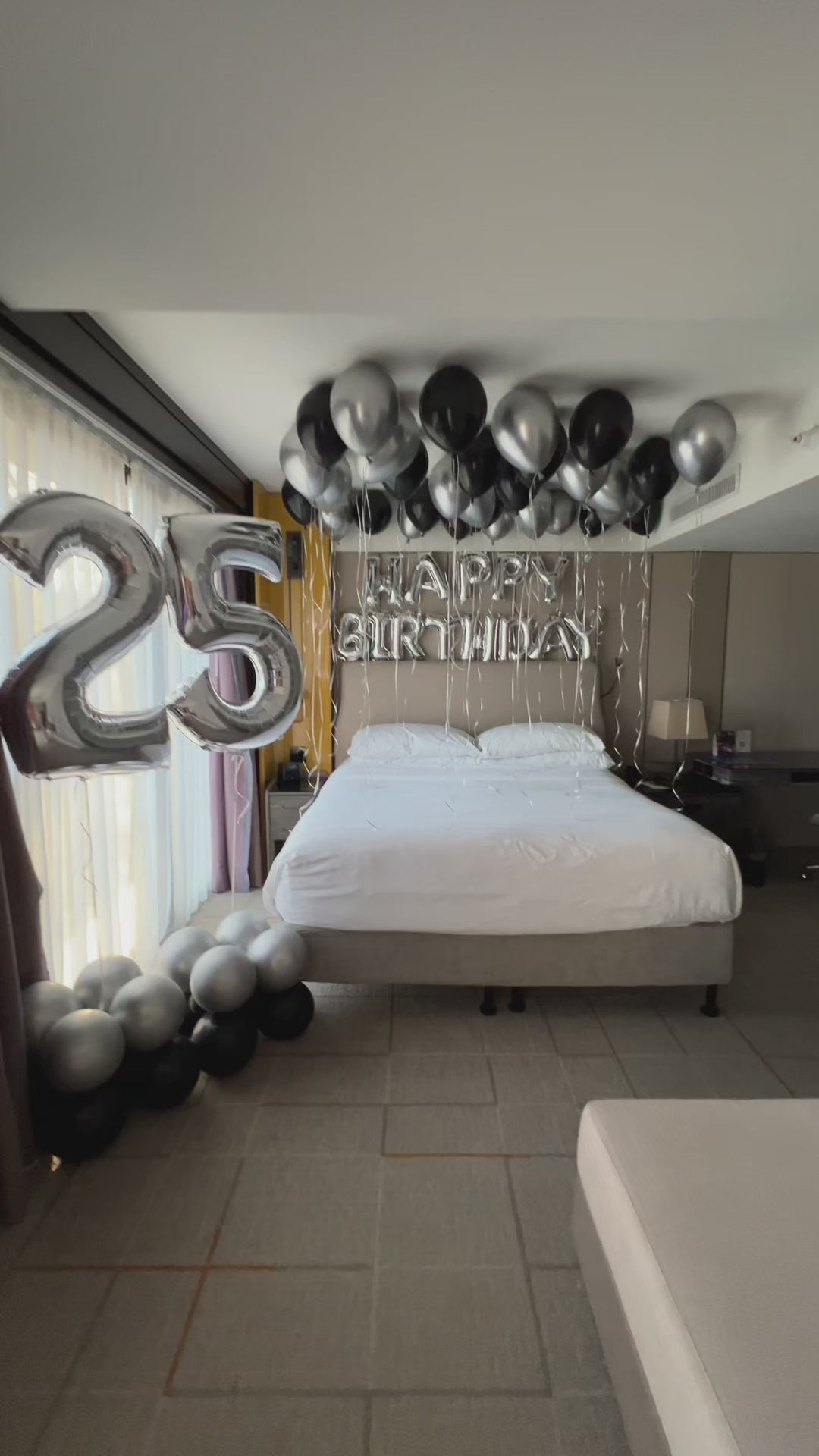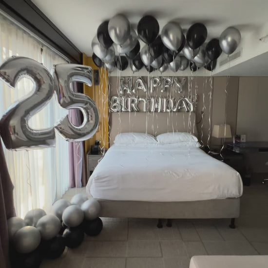 🎈 25 helium balloons (11”) + 2 foil numbers + 30 latex balloons (air) + foil “Happy Birthday” letters + ribbons